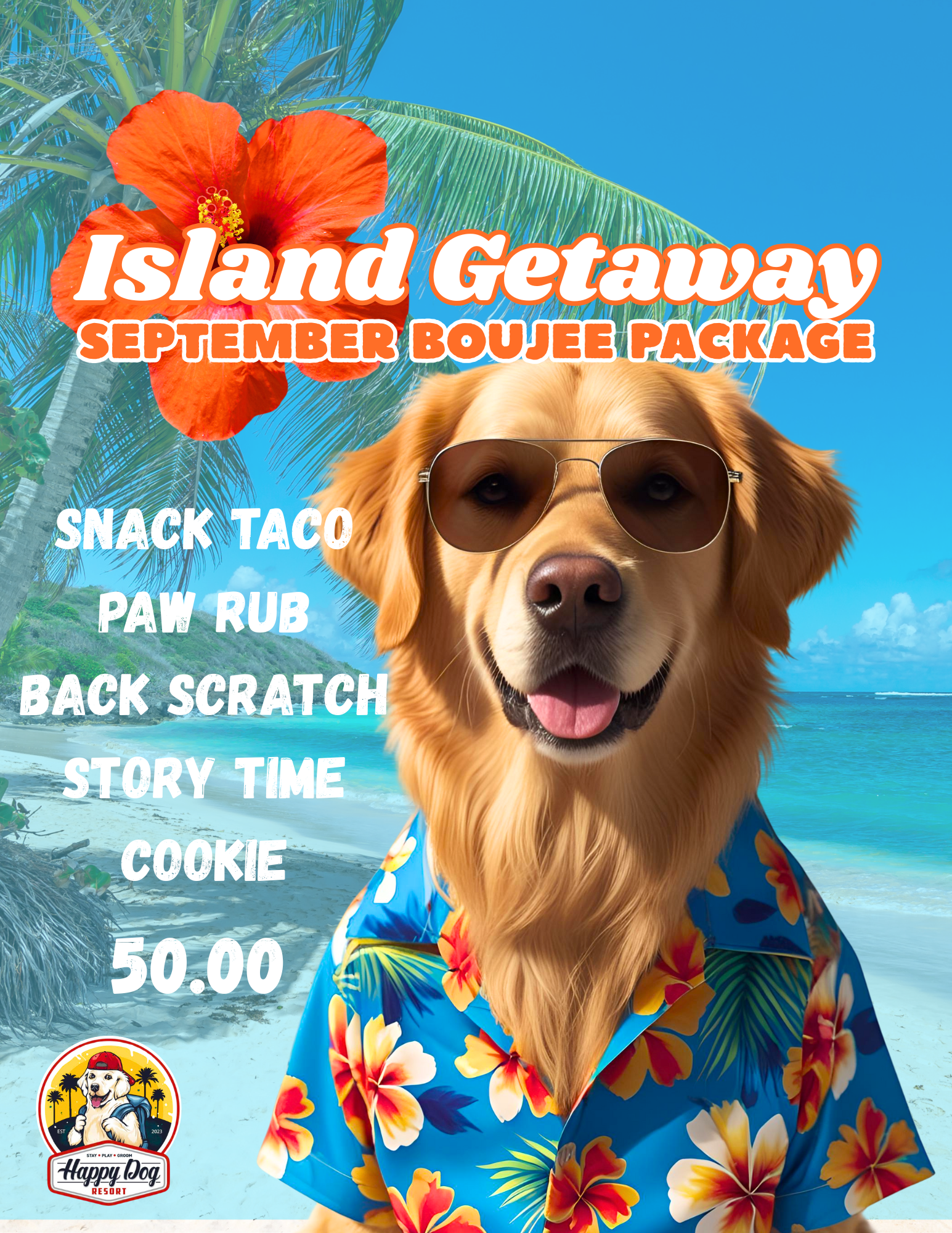 September 1 @ 6:30 am - September 30 @ 6:30 pm Island Getaway September Boujee Package Snack Taco Paw Rub Back Scratch Story Time Cookie 50.00